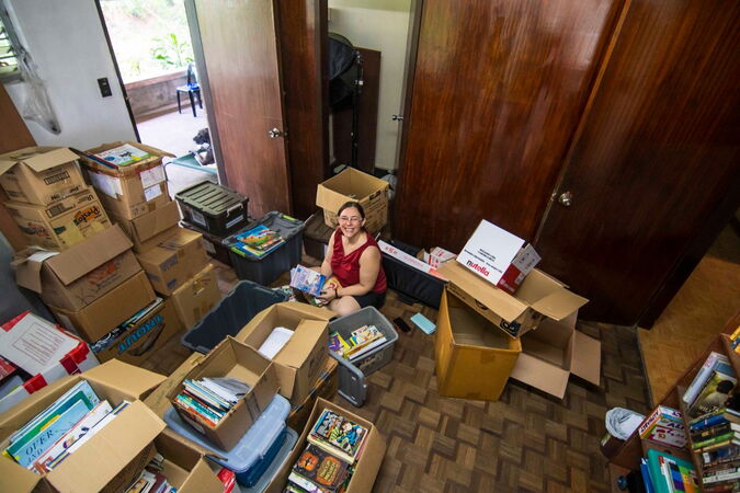 Schatten – Jedoch mangelt es an Platz, sodass die Bücher in Kisten und nicht in Regalen untergebracht sind. Das macht es schwer, ein bestimmtes Buch zu finden: War es in dieser oder jener Kiste? Ein paar Bücher sind Teil der Klassenbibliotheken, einige sind bei uns zu Hause, andere im Haus der Direktorin. Ich freue mich besonders, dass wir eine Schule bauen und dort dann eine große Bibliothek haben werden, wo alle Bücher schön organisiert in den Regalen stehen. Bitte betet mit uns für das Bauprojekt der Schule.